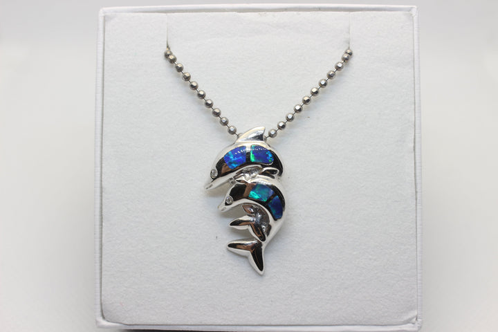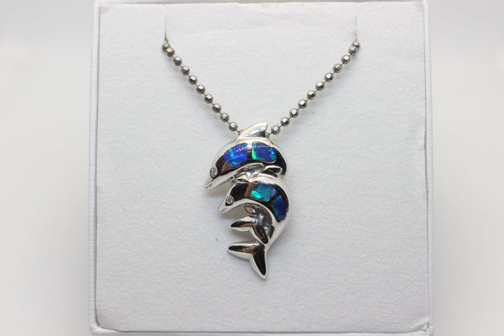 Australian Solid Inlaid Opal Pendant 14ct White Gold Twin Dolphin Setting