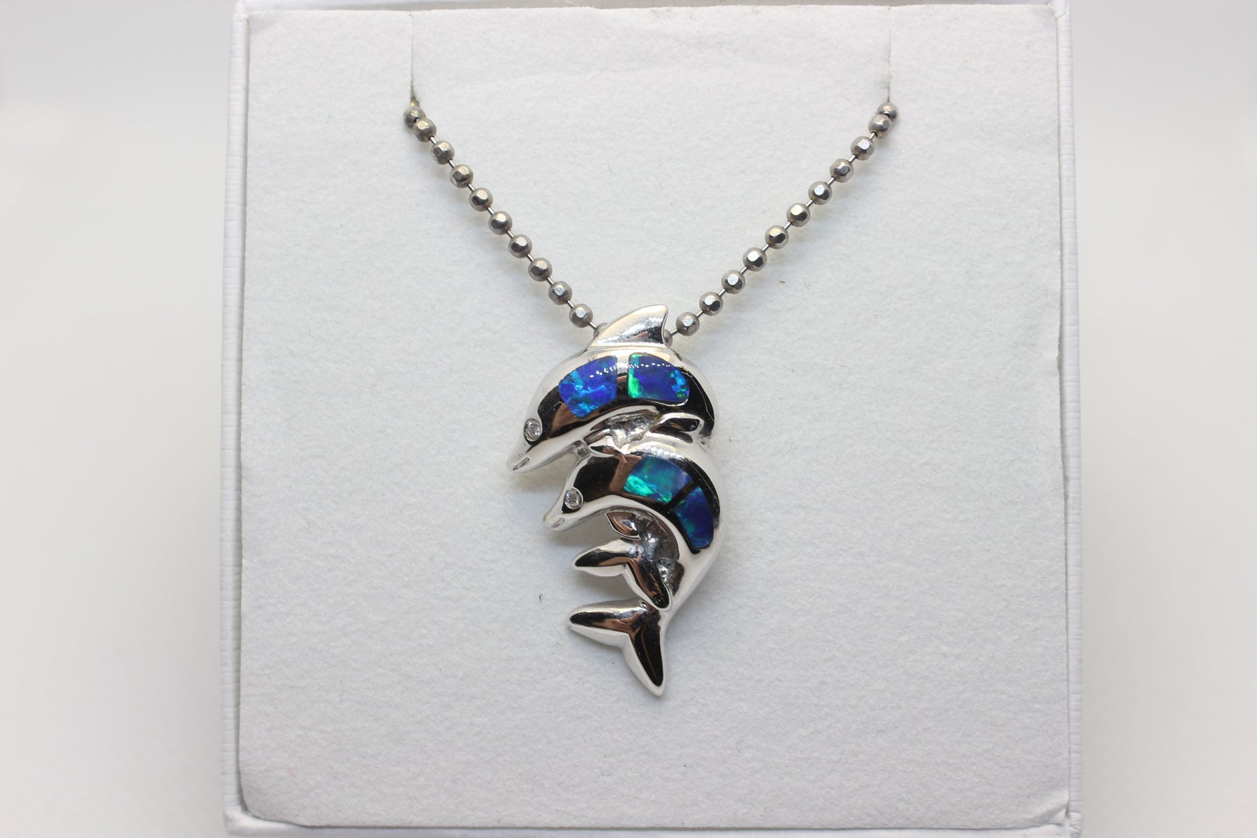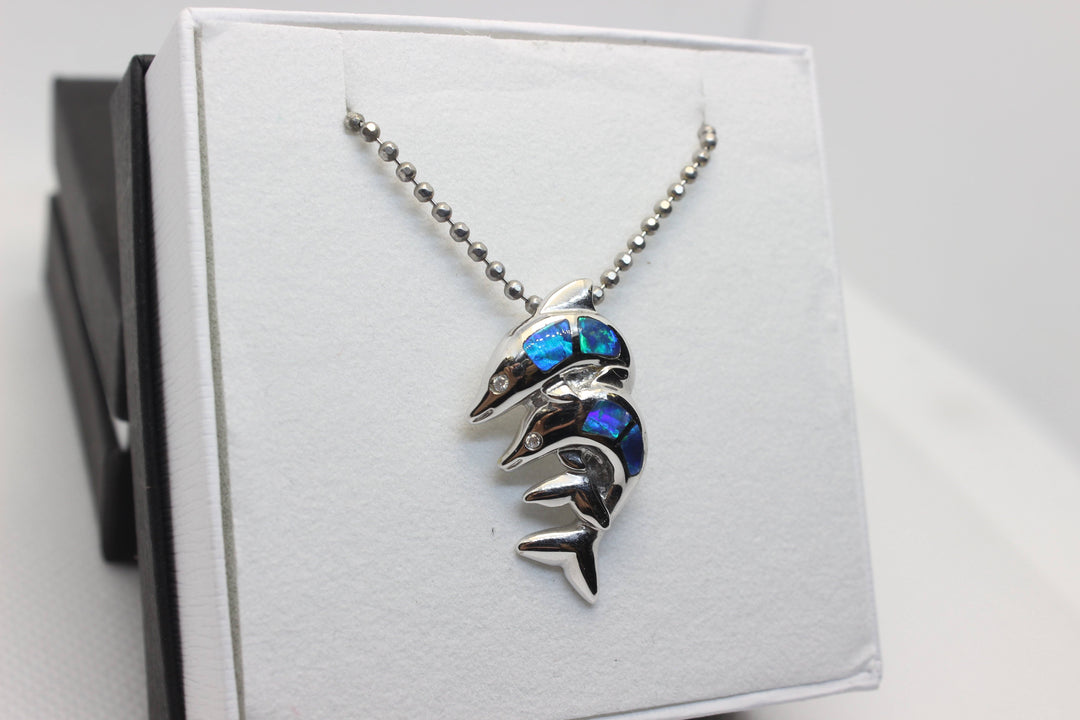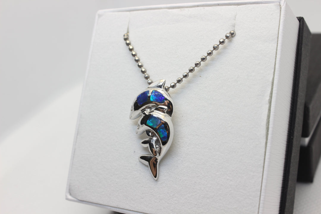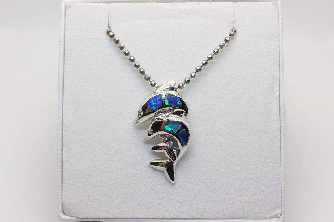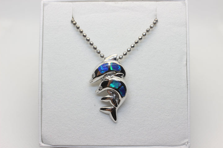 Australian Solid Inlaid Opal Pendant 14ct White Gold Twin Dolphin Setting Pendant Australian Opal House
