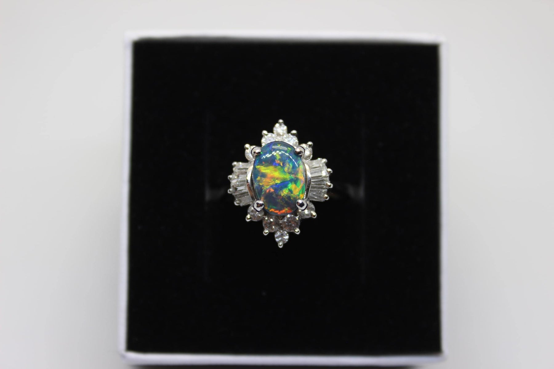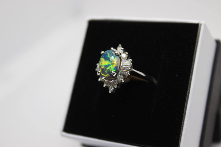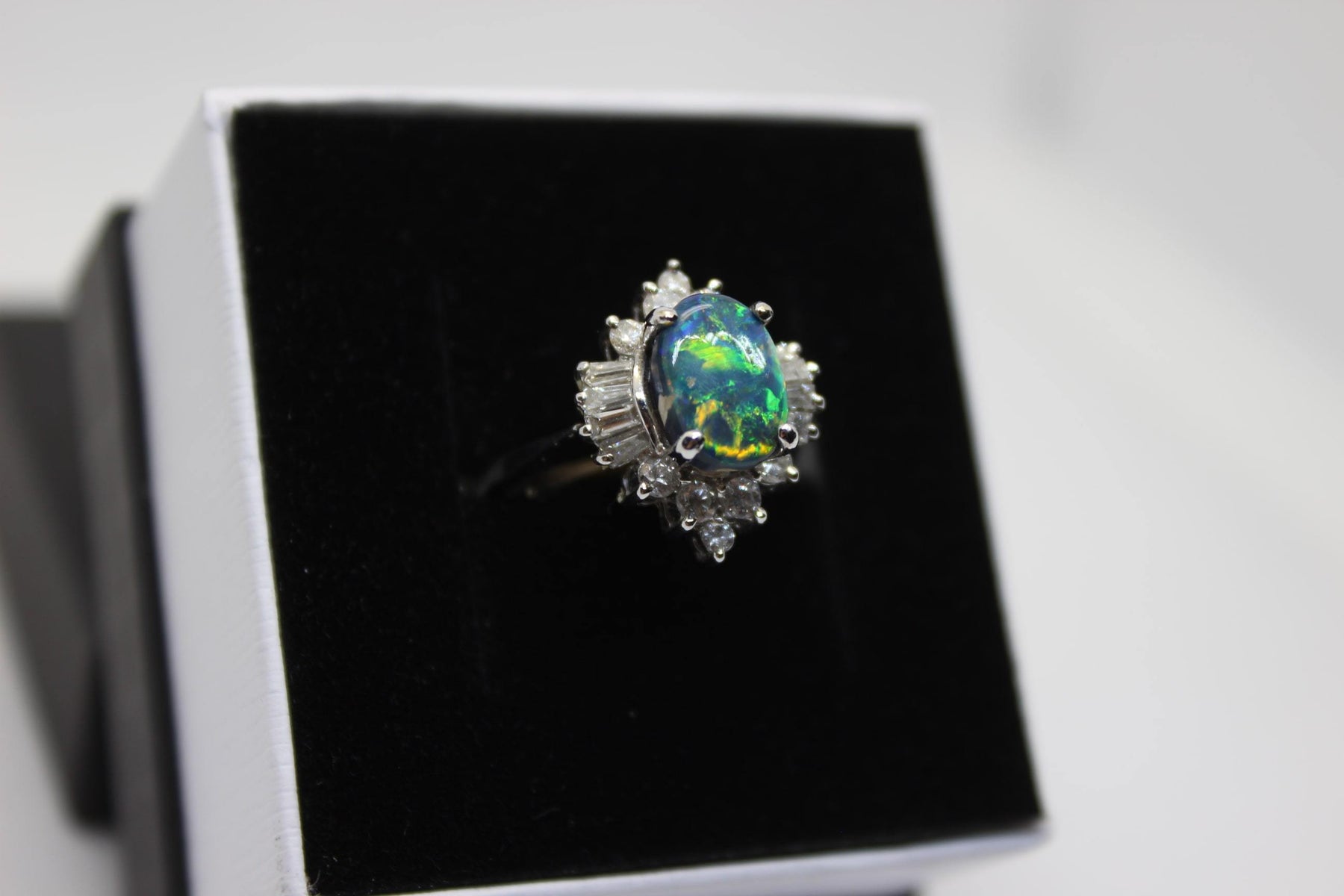 A Beautiful Black Opal Ring in an 18K White Gold Setting.