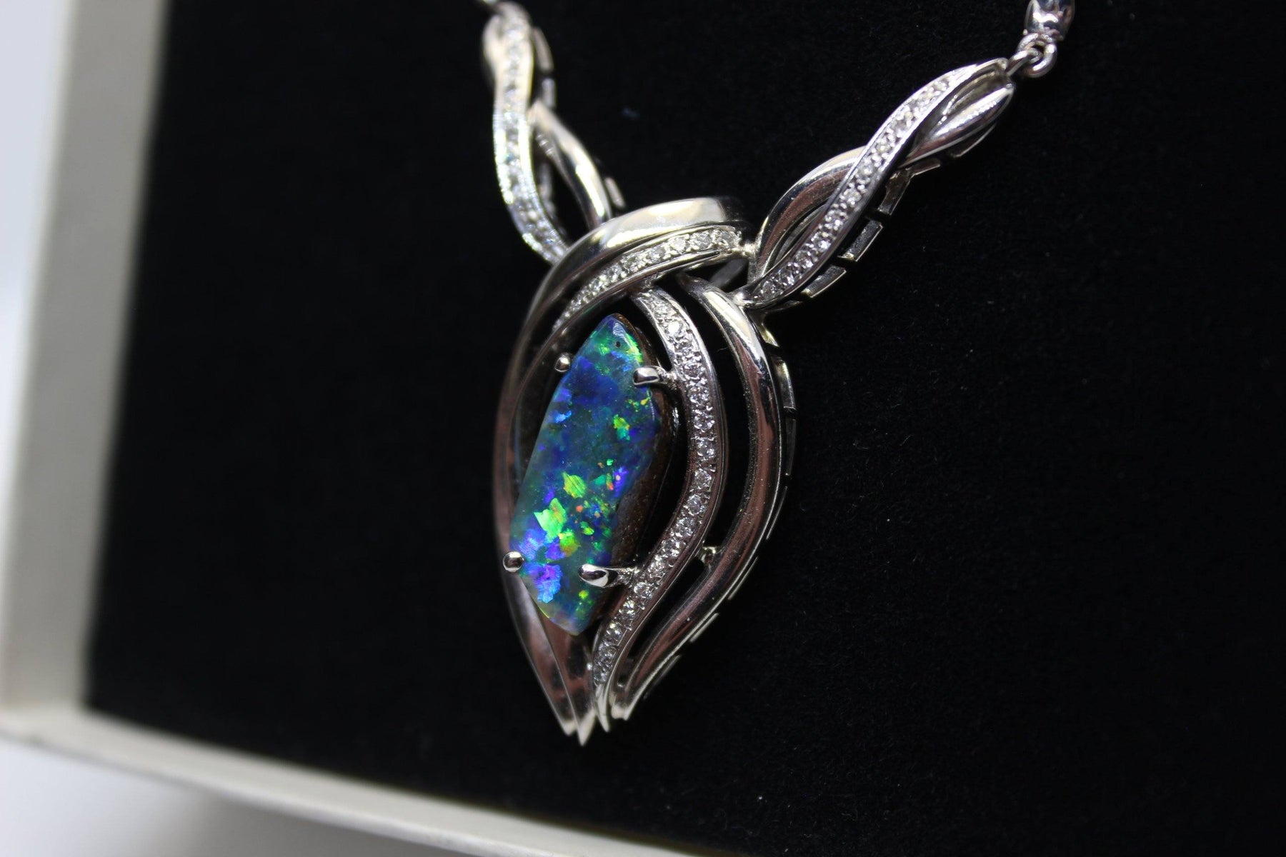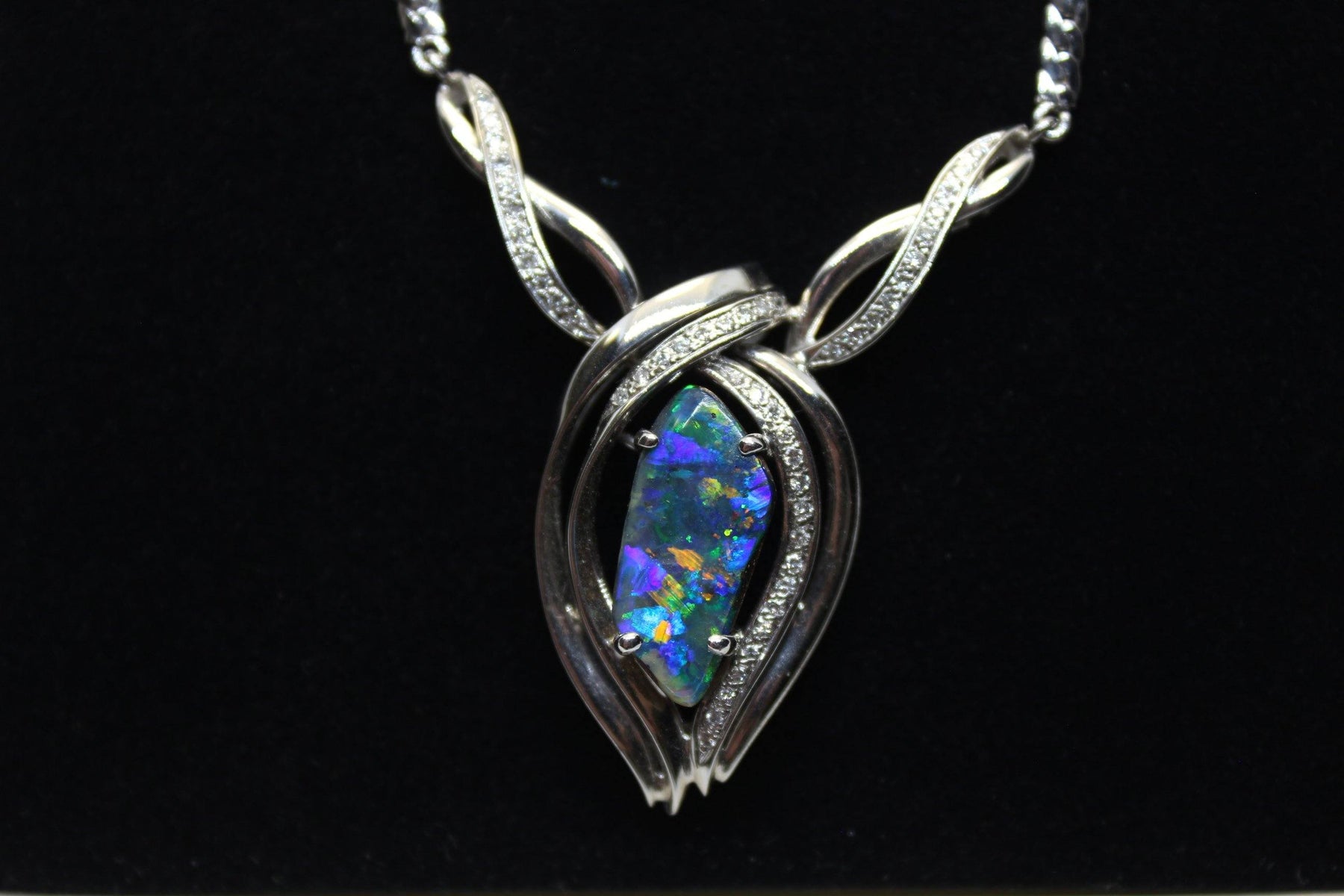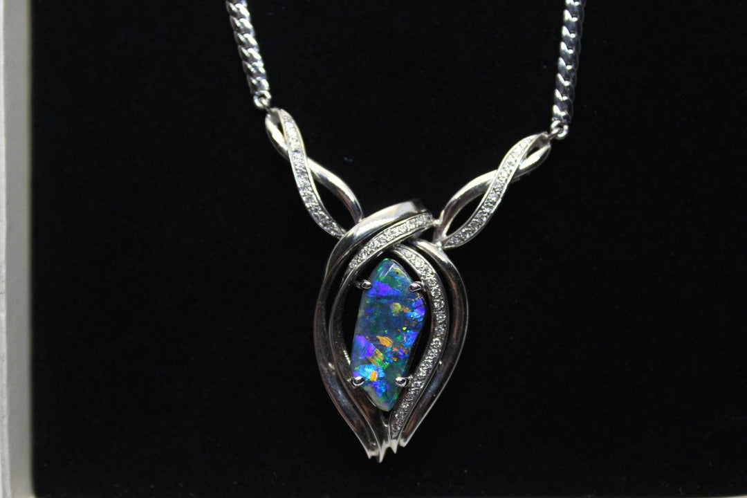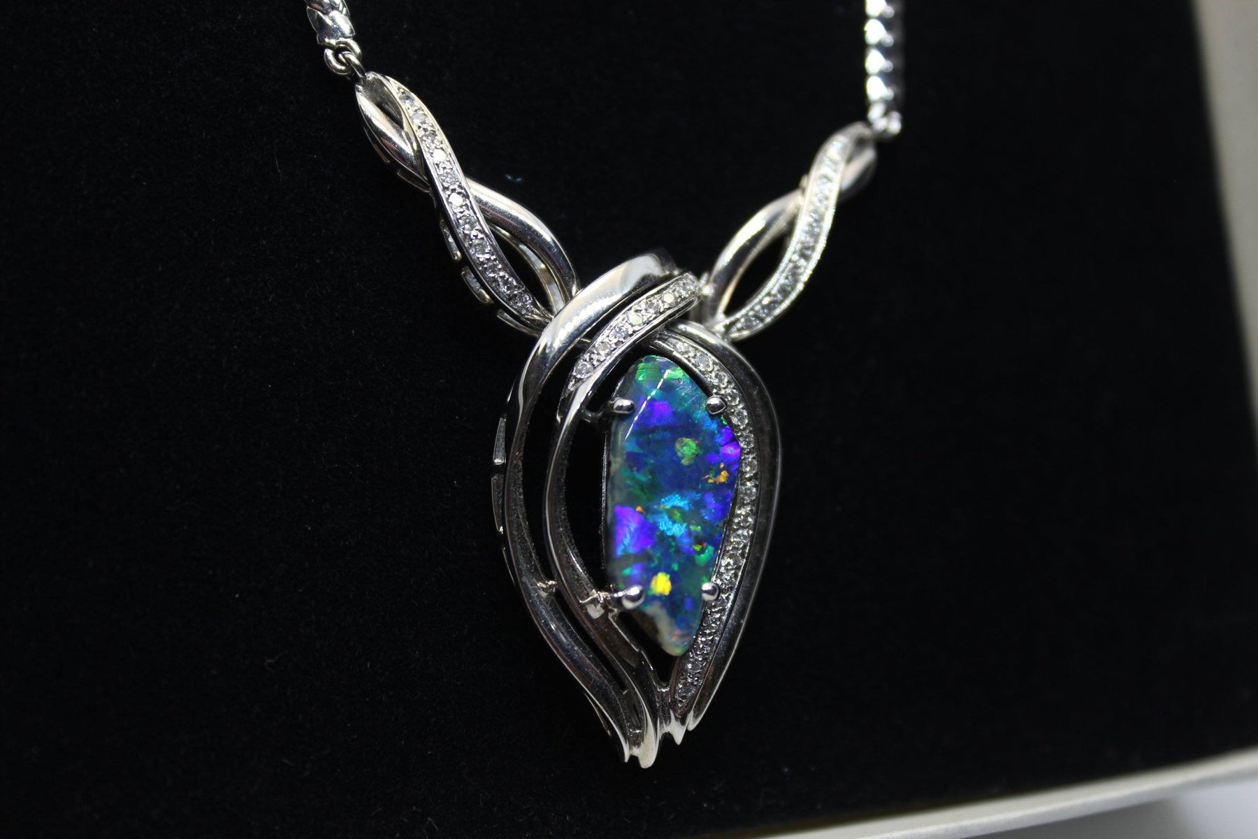 Australian Natural Black Opal Pendant in 18k White Gold Setting Pendant Australian Opal House