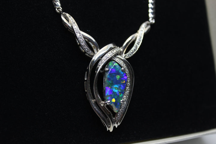 A Stunning Natural Black Opal Pendant in 18K White Gold Setting.