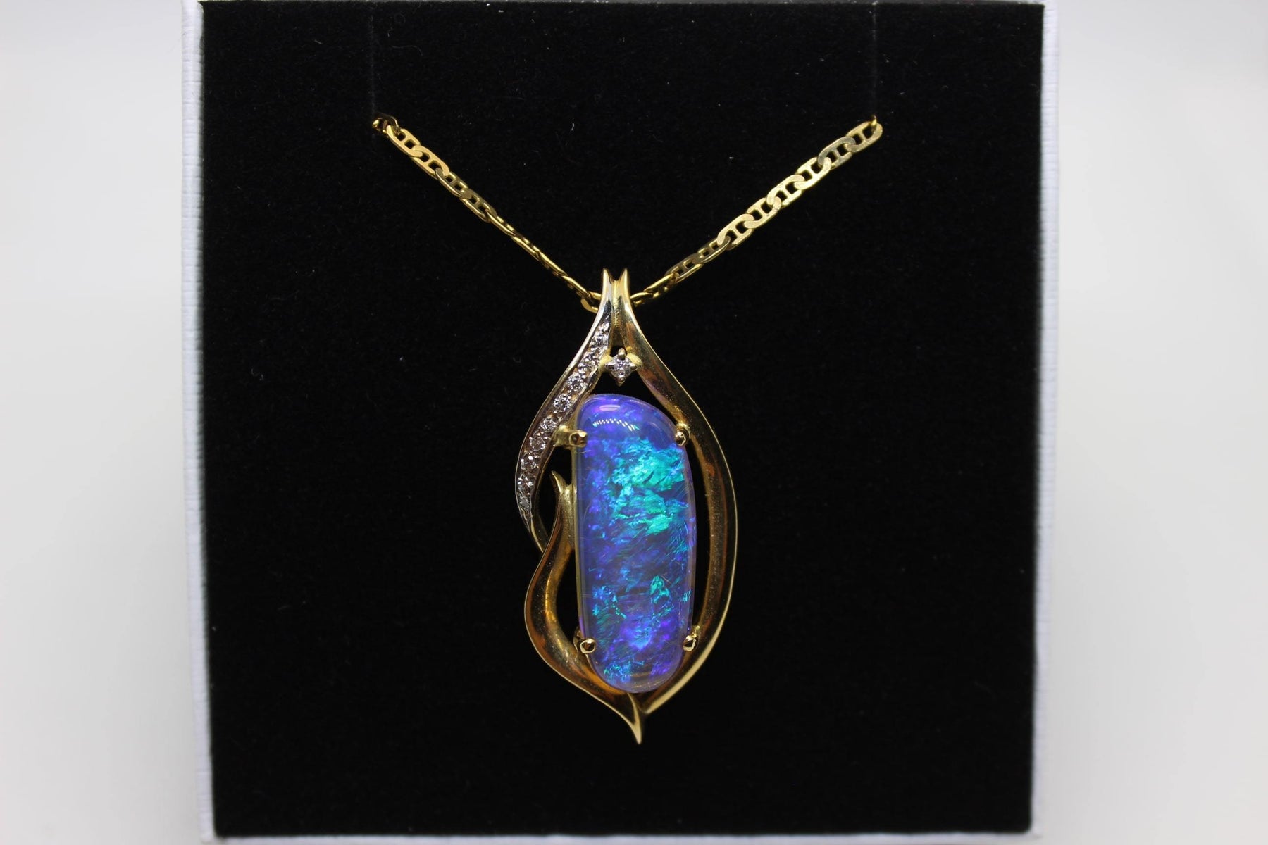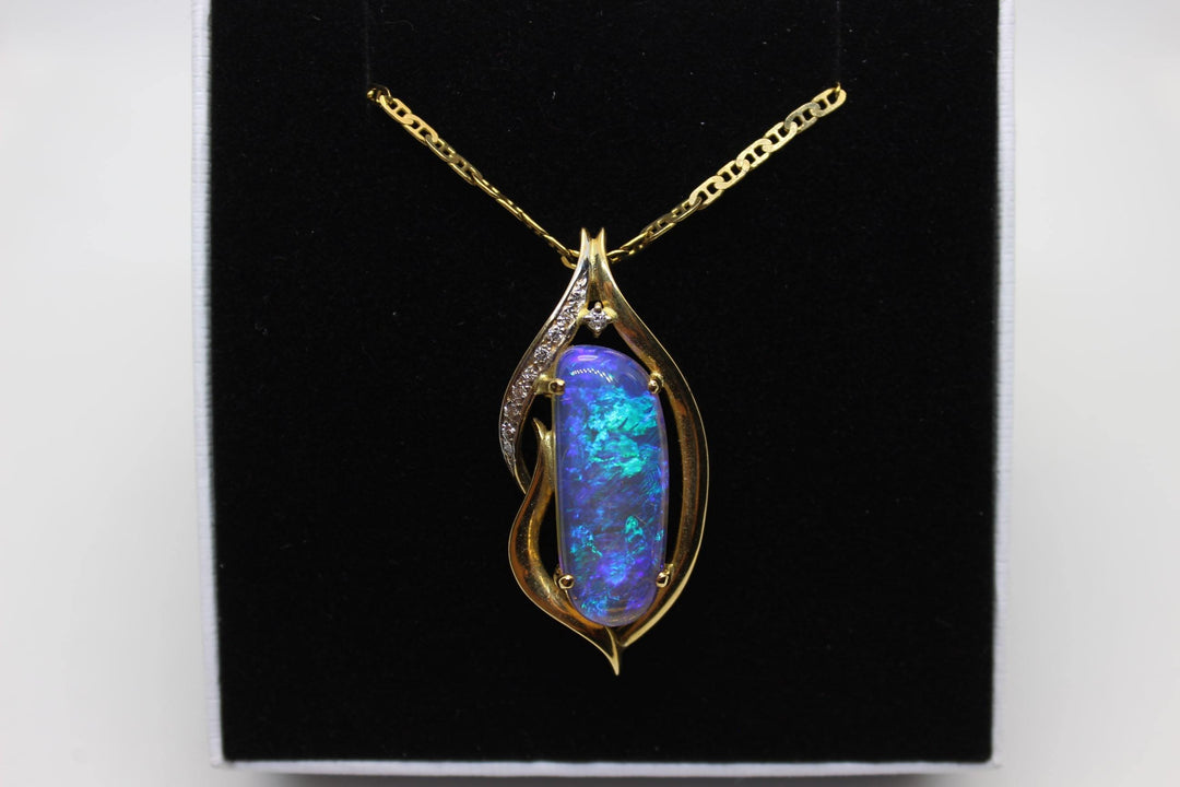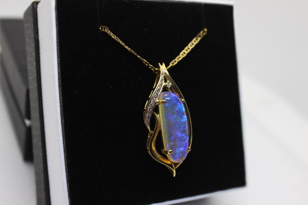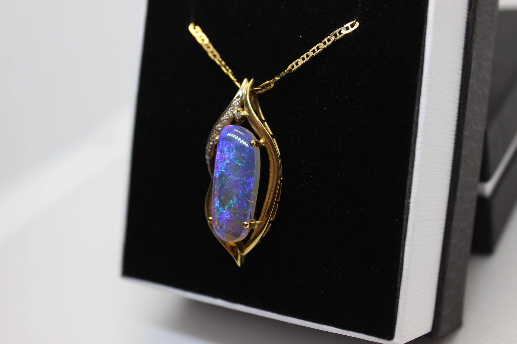 Australian Natural Crystal Opal Pendant in 18k Yellow Gold Setting with 10 Diamonds Pendant Australian Opal House