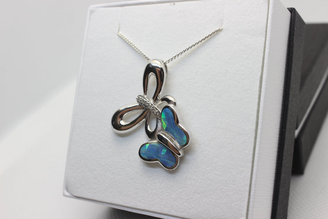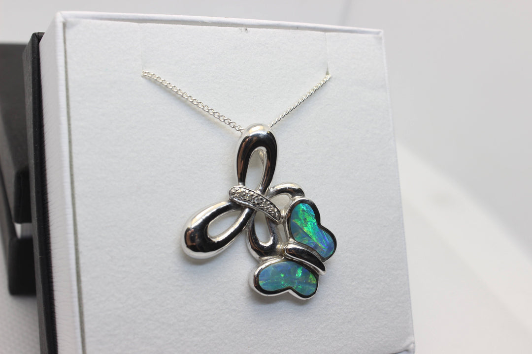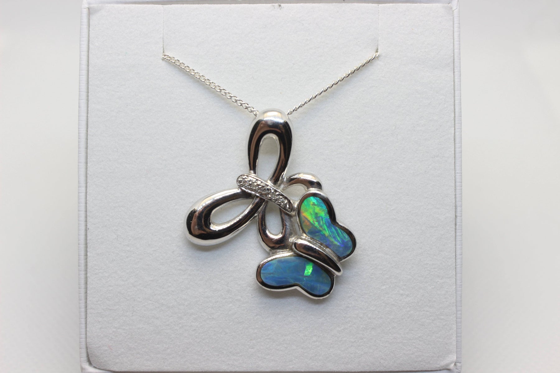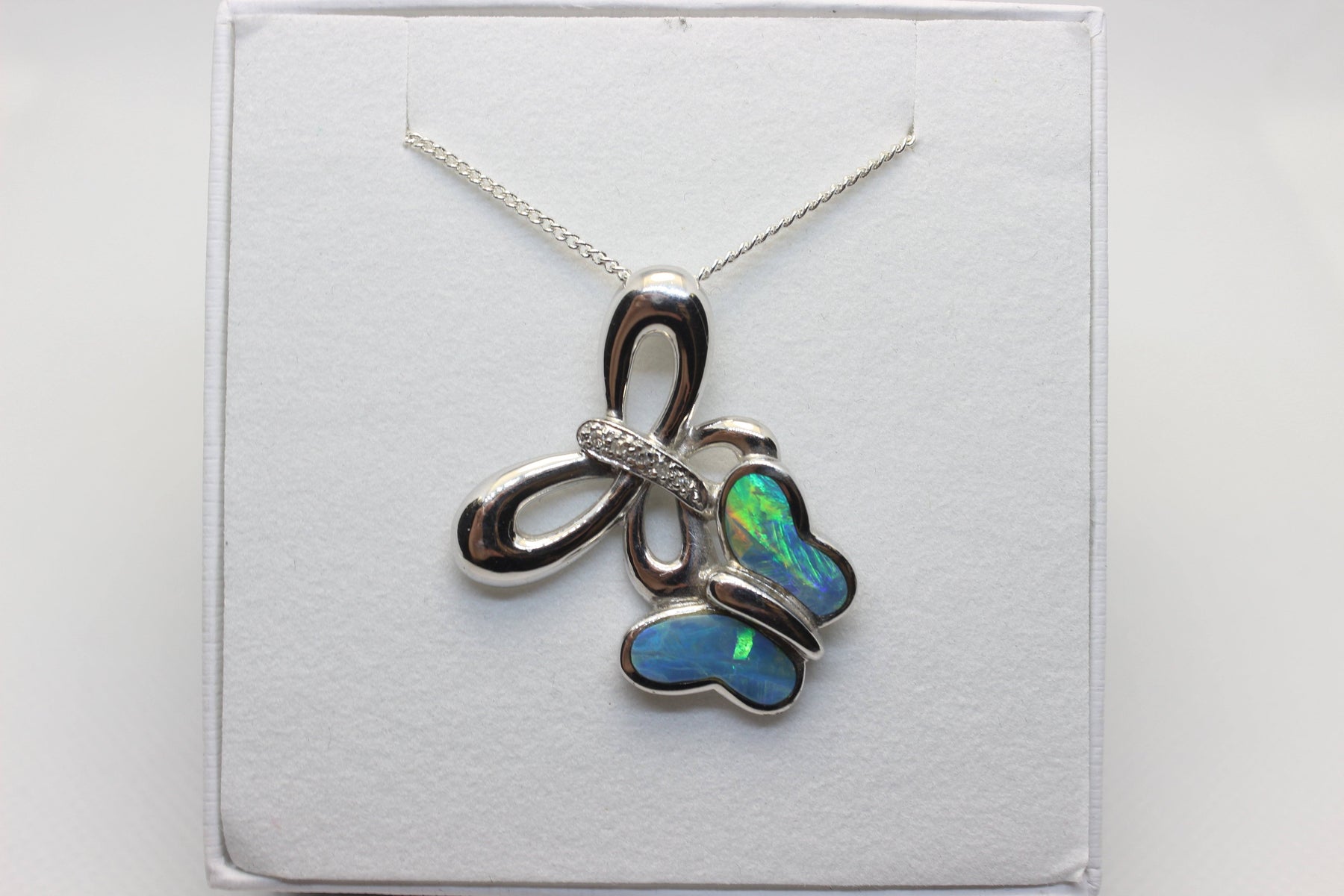 Australian Solid Inlaid Opal Pendant 14ct White Gold Setting Butterfly Pendant Australian Opal House