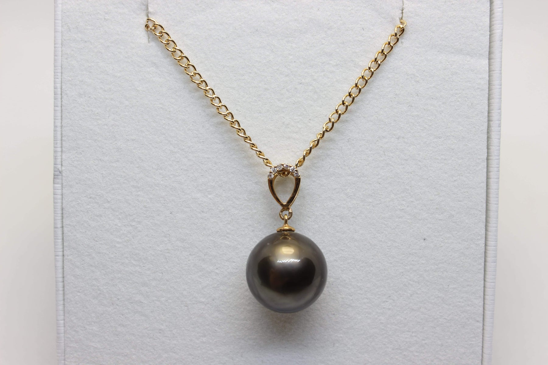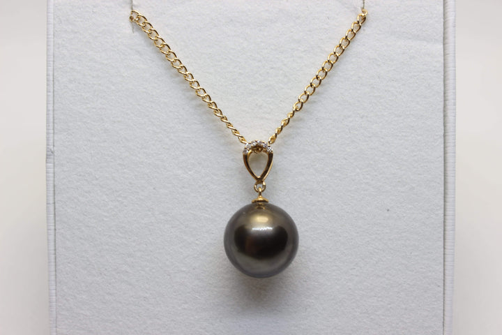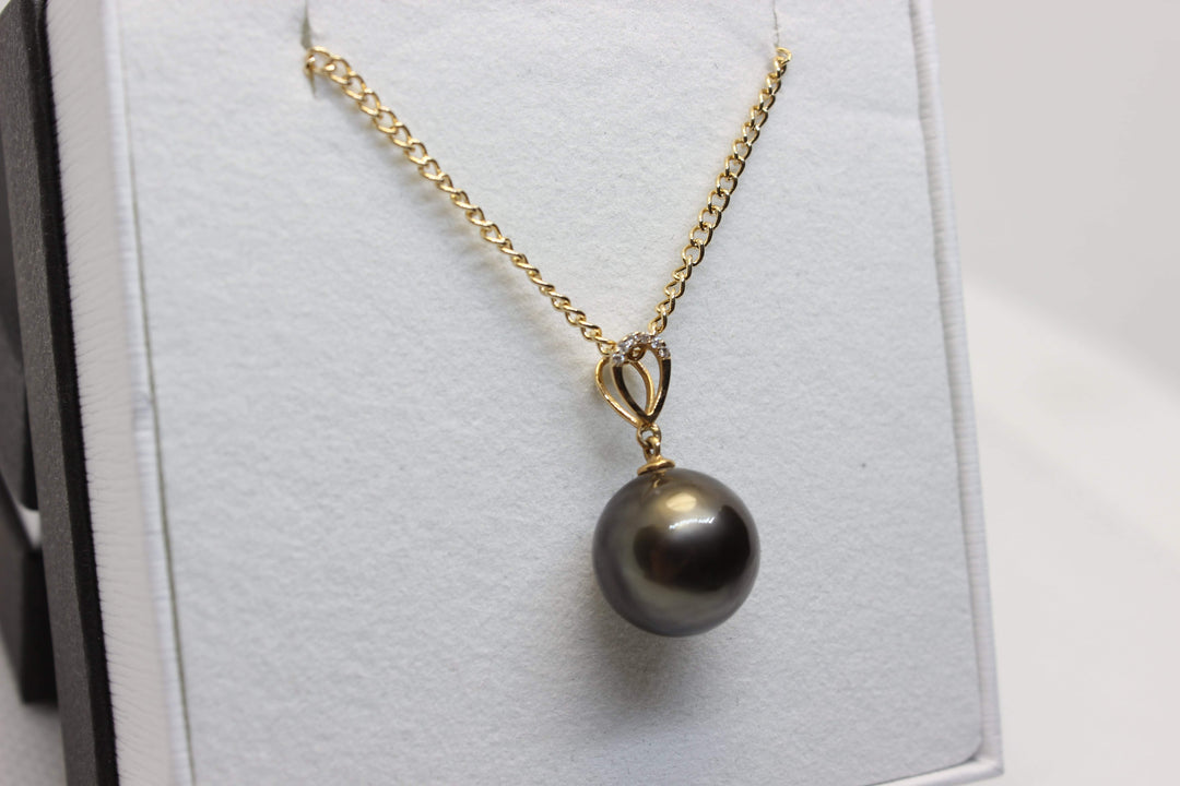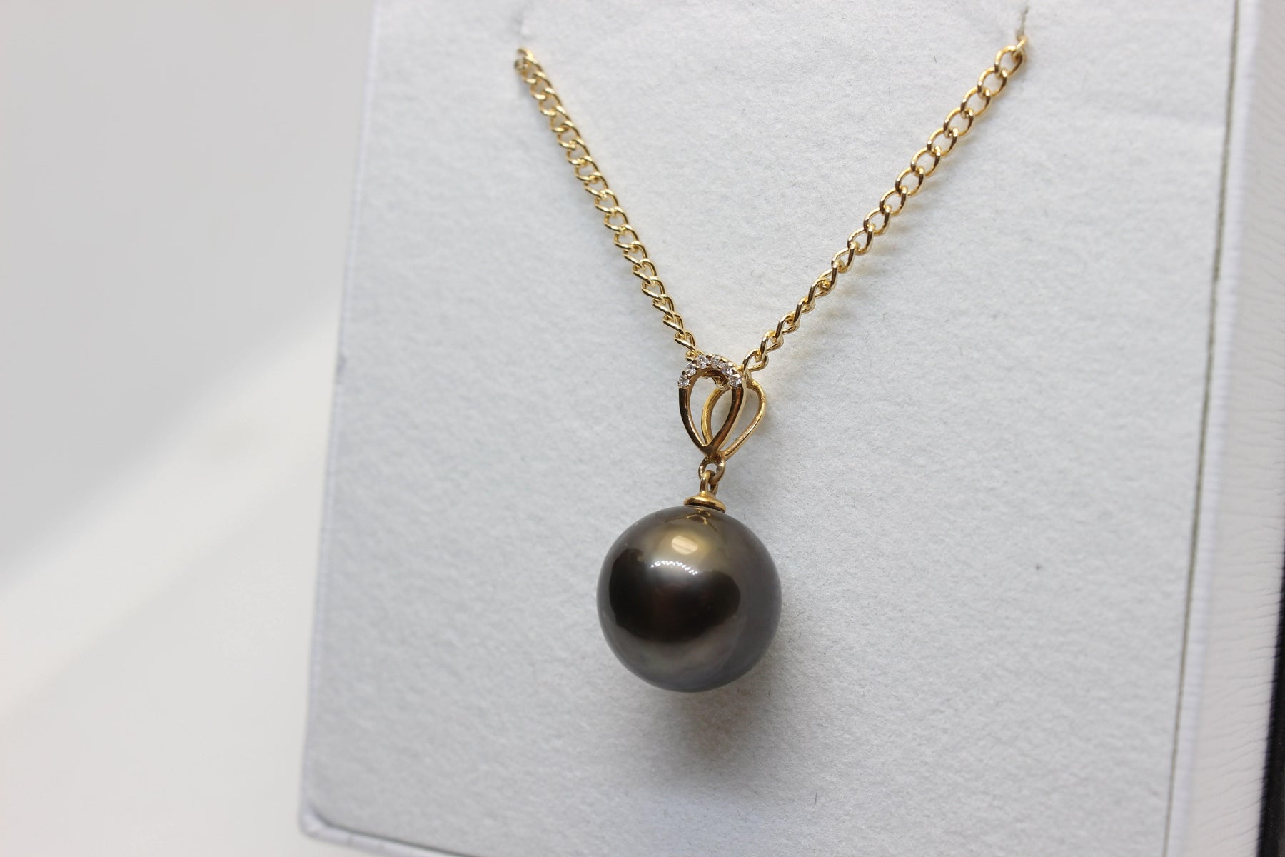 Natural South Sea Tahitian Black Pearl in 18k Yellow Gold Setting w/ 6 Diamonds Pendant Australian Opal House
