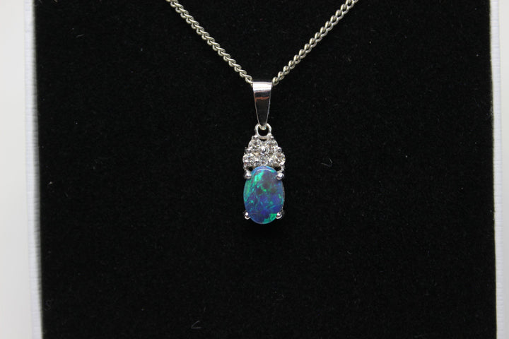 A Stunning Natural Black Opal Pendant in 18K White Gold Setting.