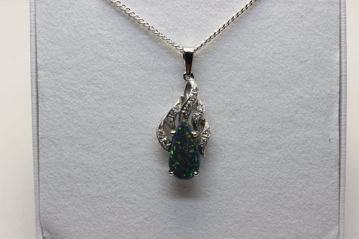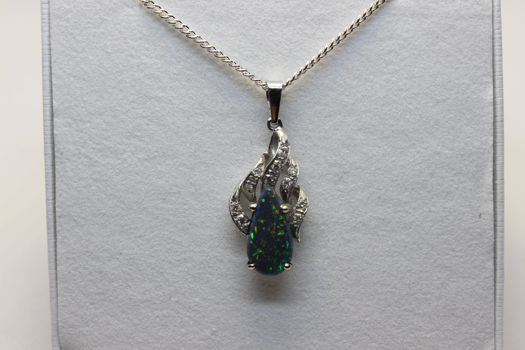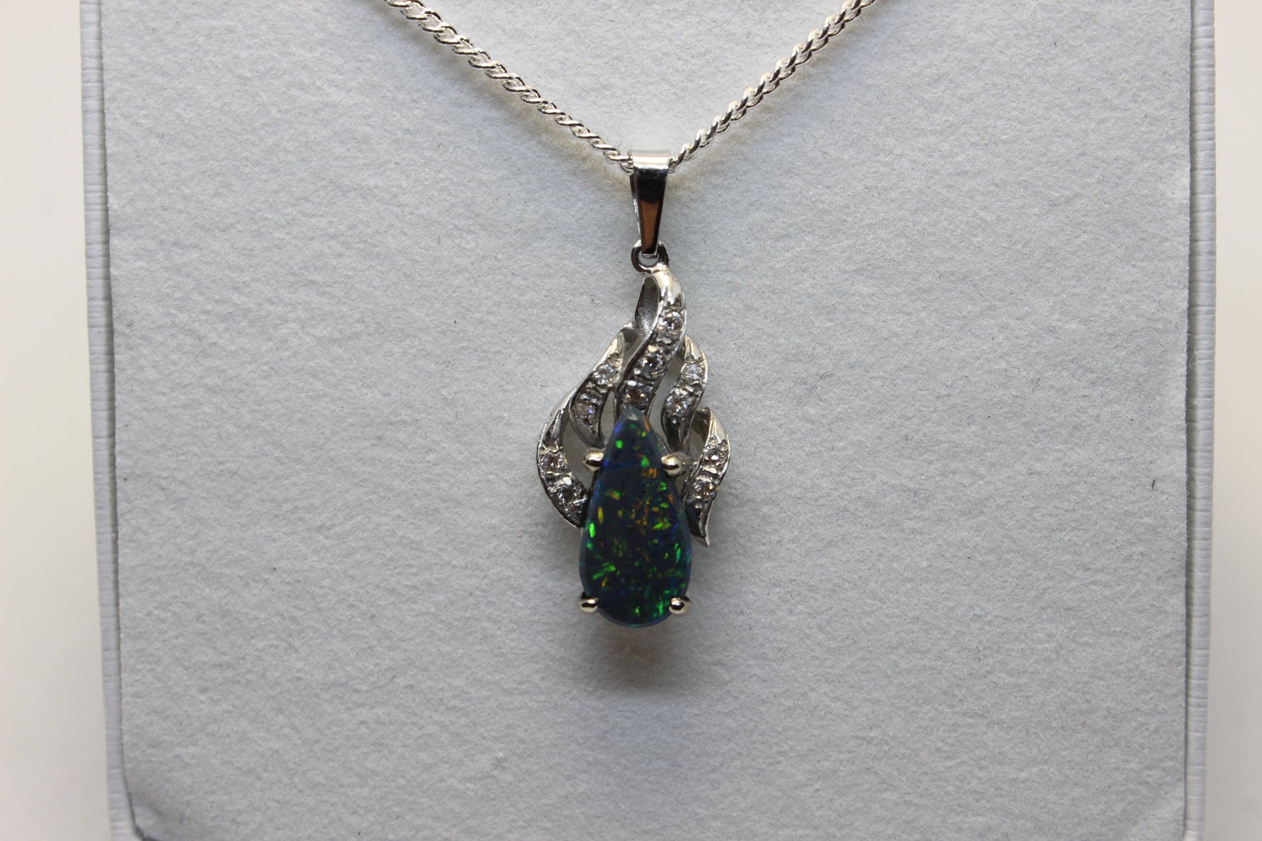 A Stunning Natural Black Opal Pendant in 18K White Gold Setting.