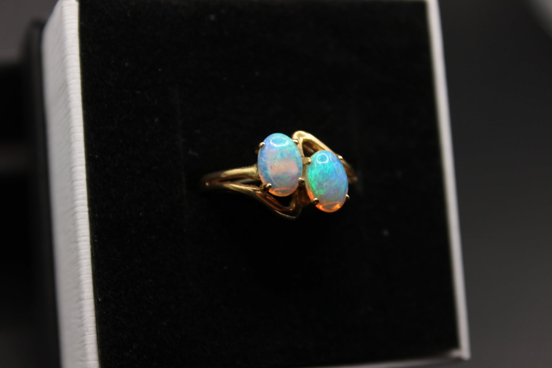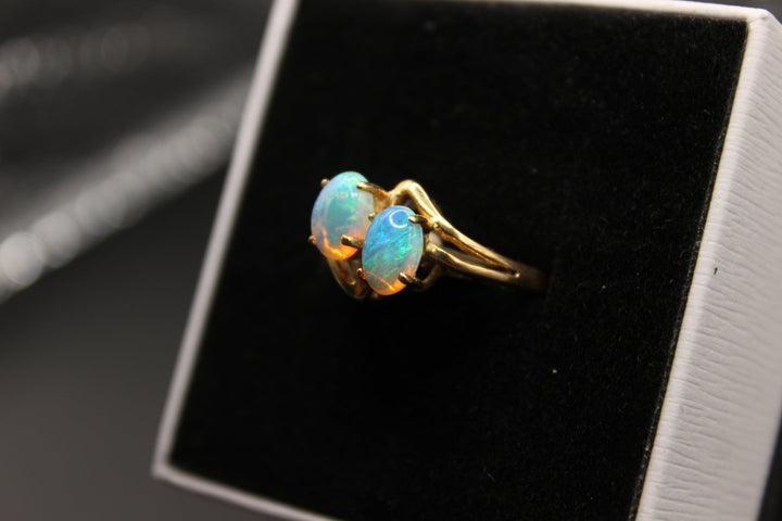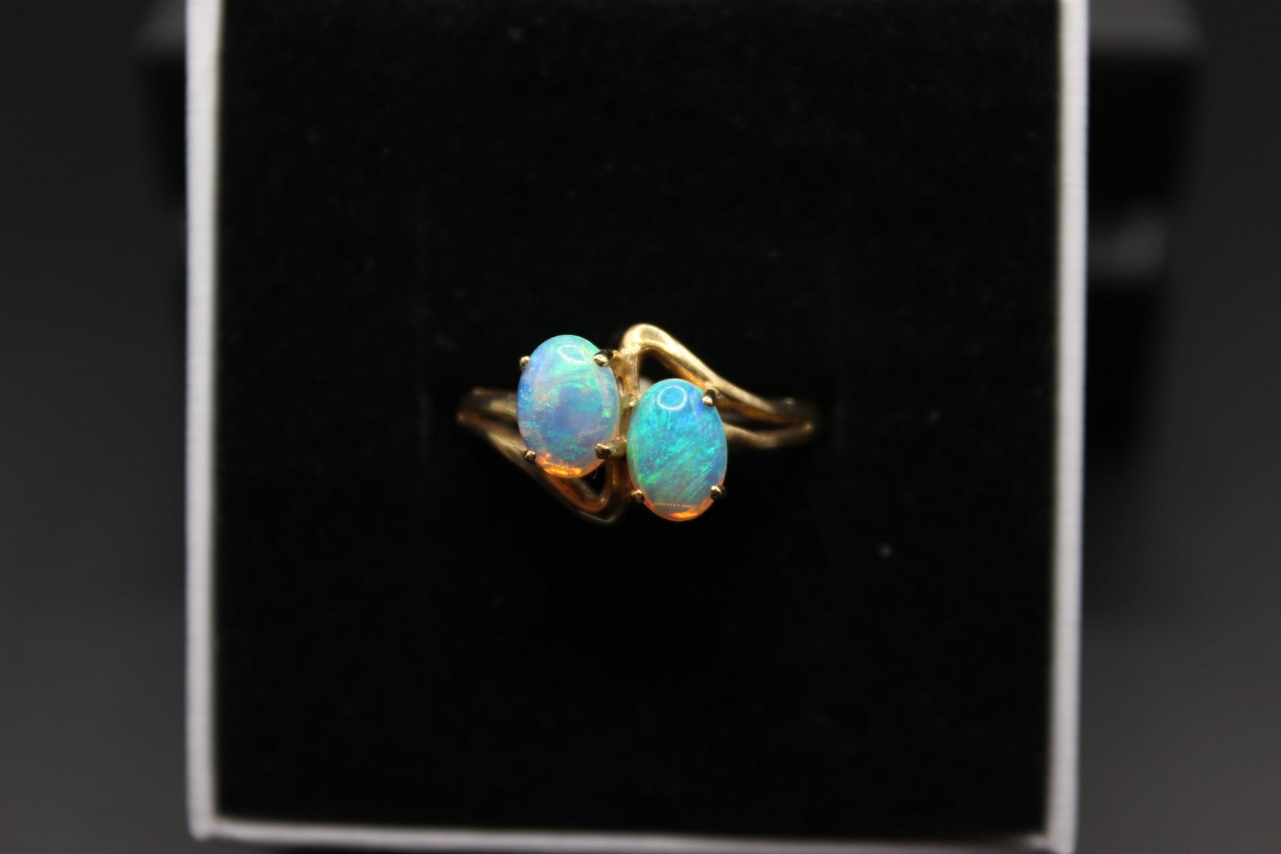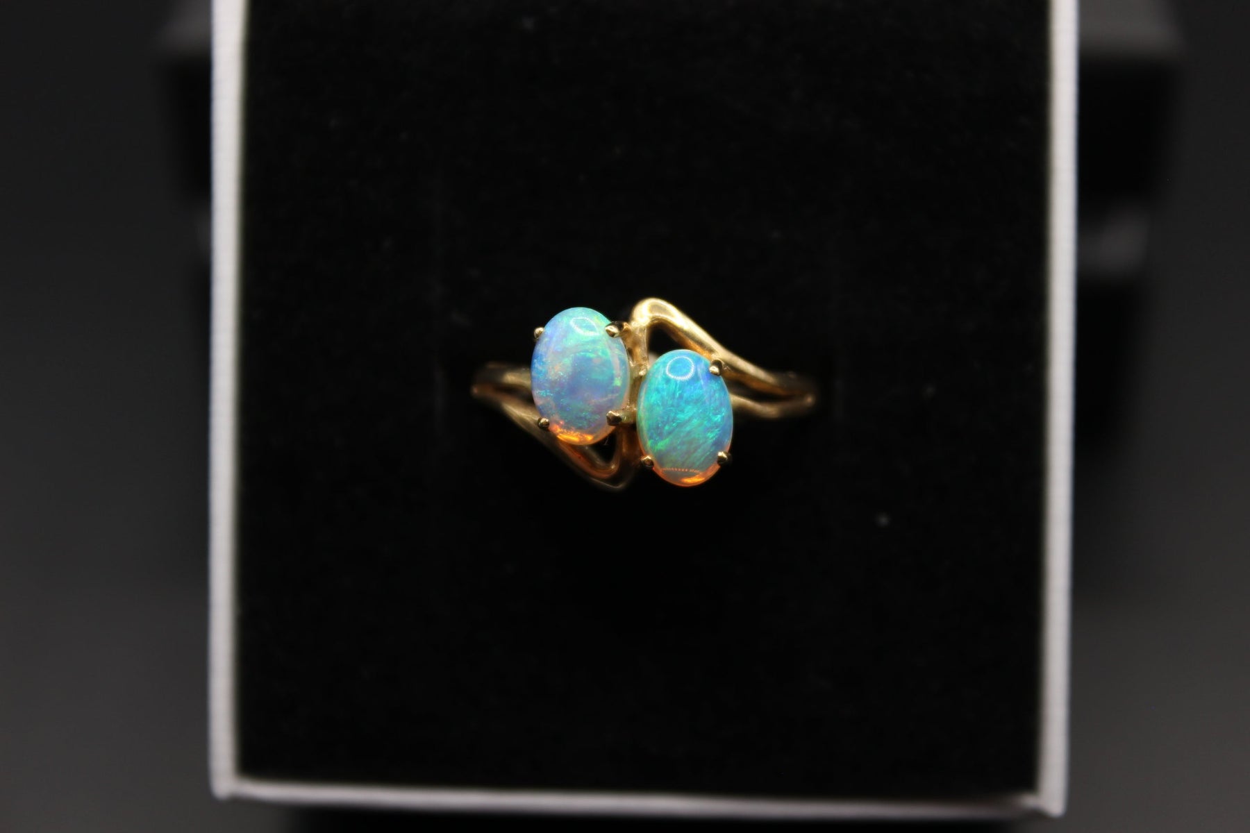 • Gem: Two Australian Natural Solid Opal Ring 14k Yellow Gold Setting  - Gem Quality: A+