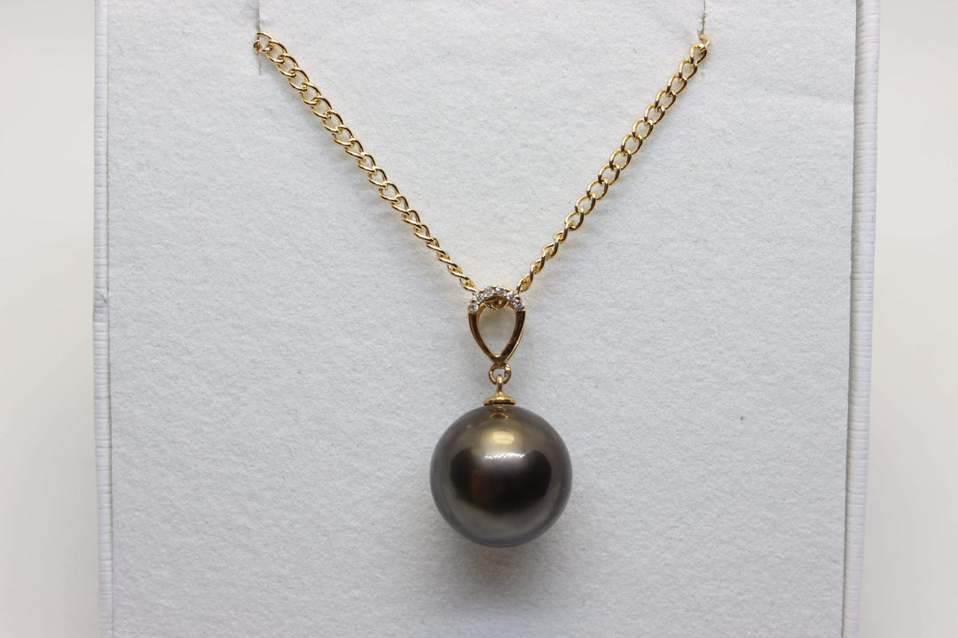Natural South Sea Tahitian Black Pearl in 18k Yellow Gold Setting w/ 6 Diamonds