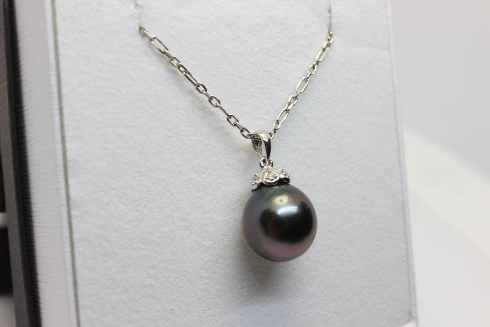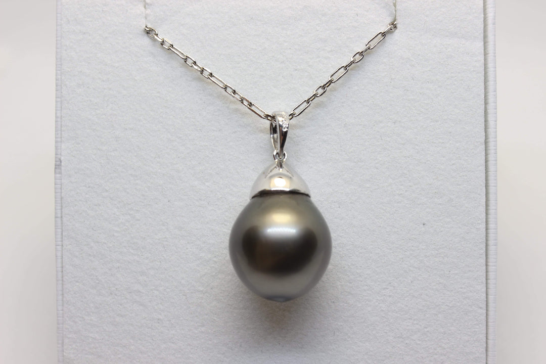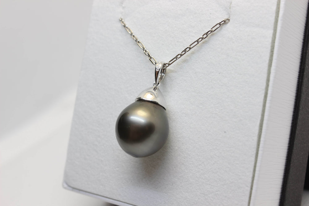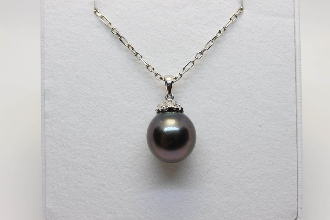 Natural South Sea Tahitian Black Pearl in 18k White Gold Setting w/ 3 Diamonds