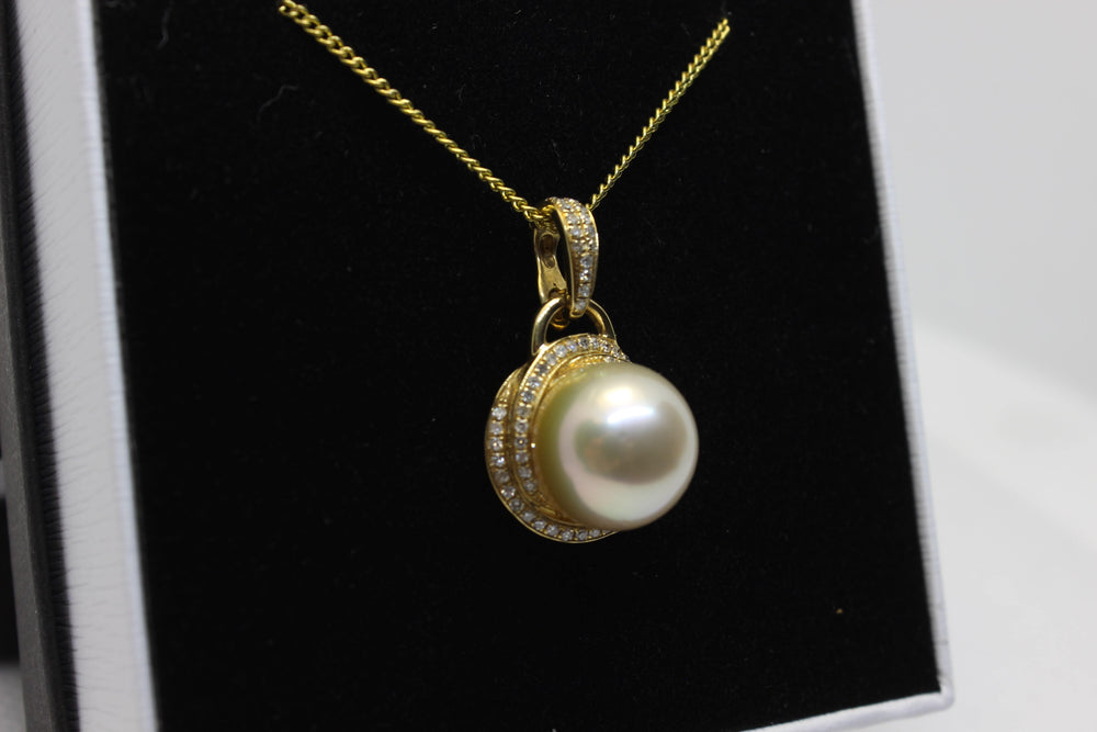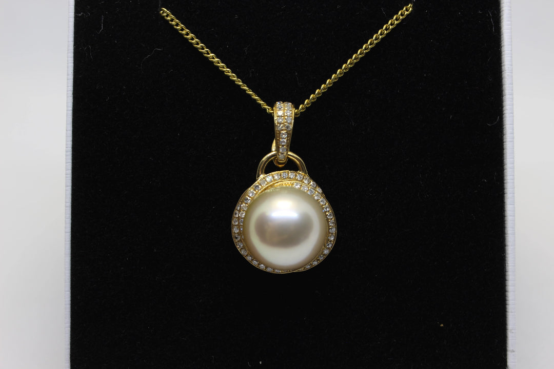 Natural South Sea Tahitian White Pearl in 18k Yellow Gold Setting w/ Melee Diamonds