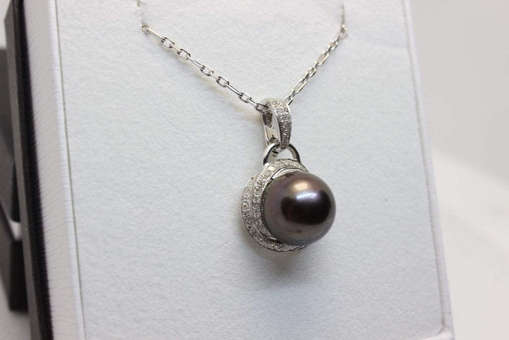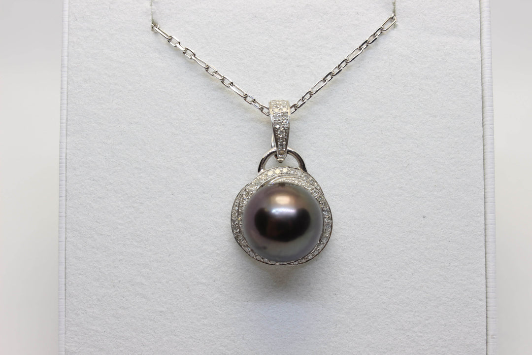 Natural South Sea Tahitian Black Pearl in 18k White Gold Setting w/ Melee Diamonds